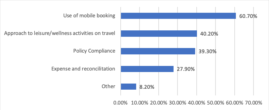 For instance, in Figure 1, below, survey respondents reported that travelers’ behavior and practices varied most by age group in the use of mobile booking (60.70%), their approach to leisure or wellness activities during travel, (40.20%), in policy compliance (39.30%), and expense and reconciliation (27.90%).