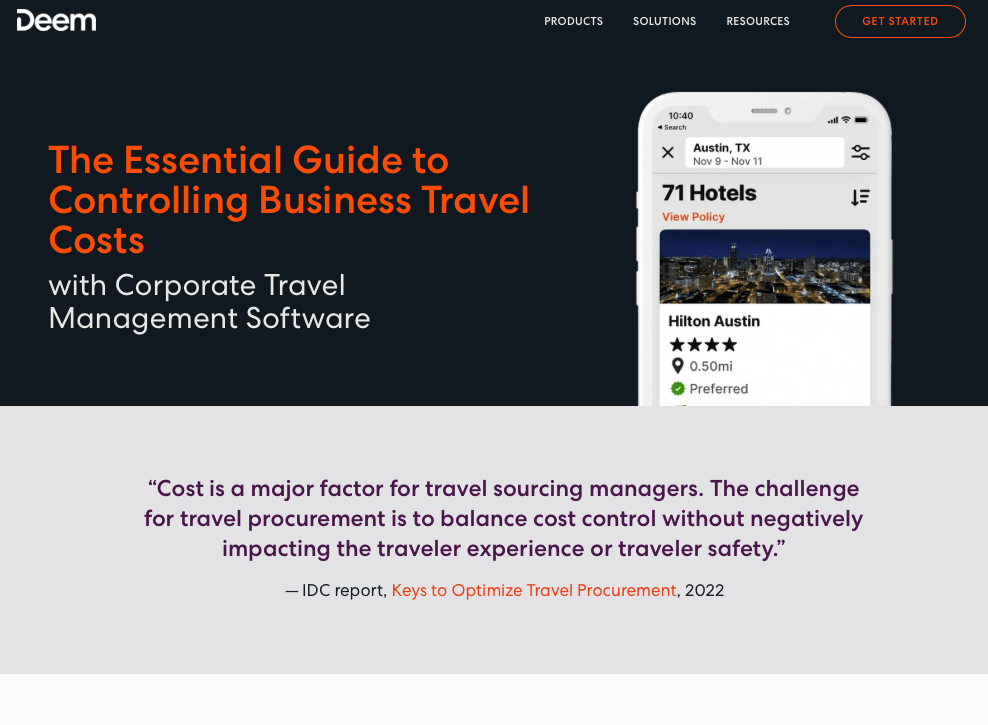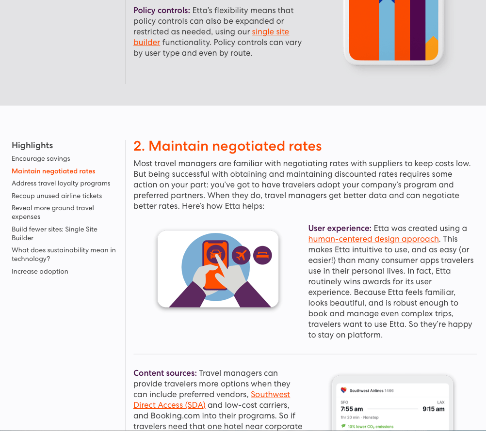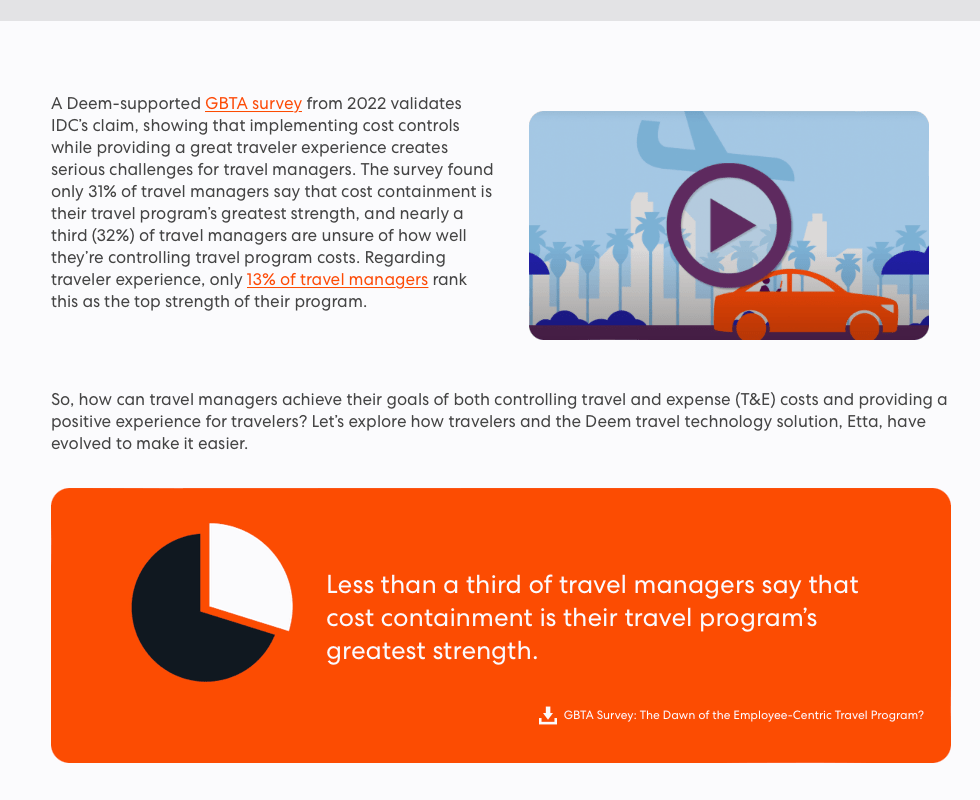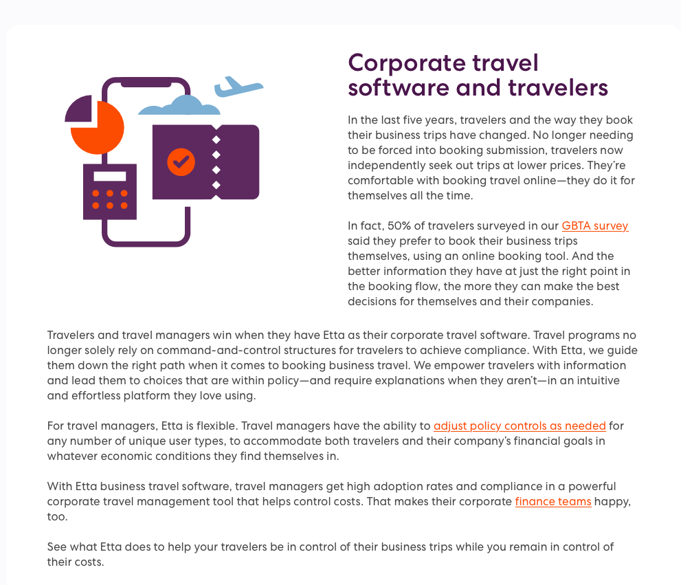Because controlling business travel program costs is the primary concern of the audience, I created a long solutions page that outlines the benefits of the product for travel managers. I determined the page’s layout and wrote it both for SEO and audience usefulness.