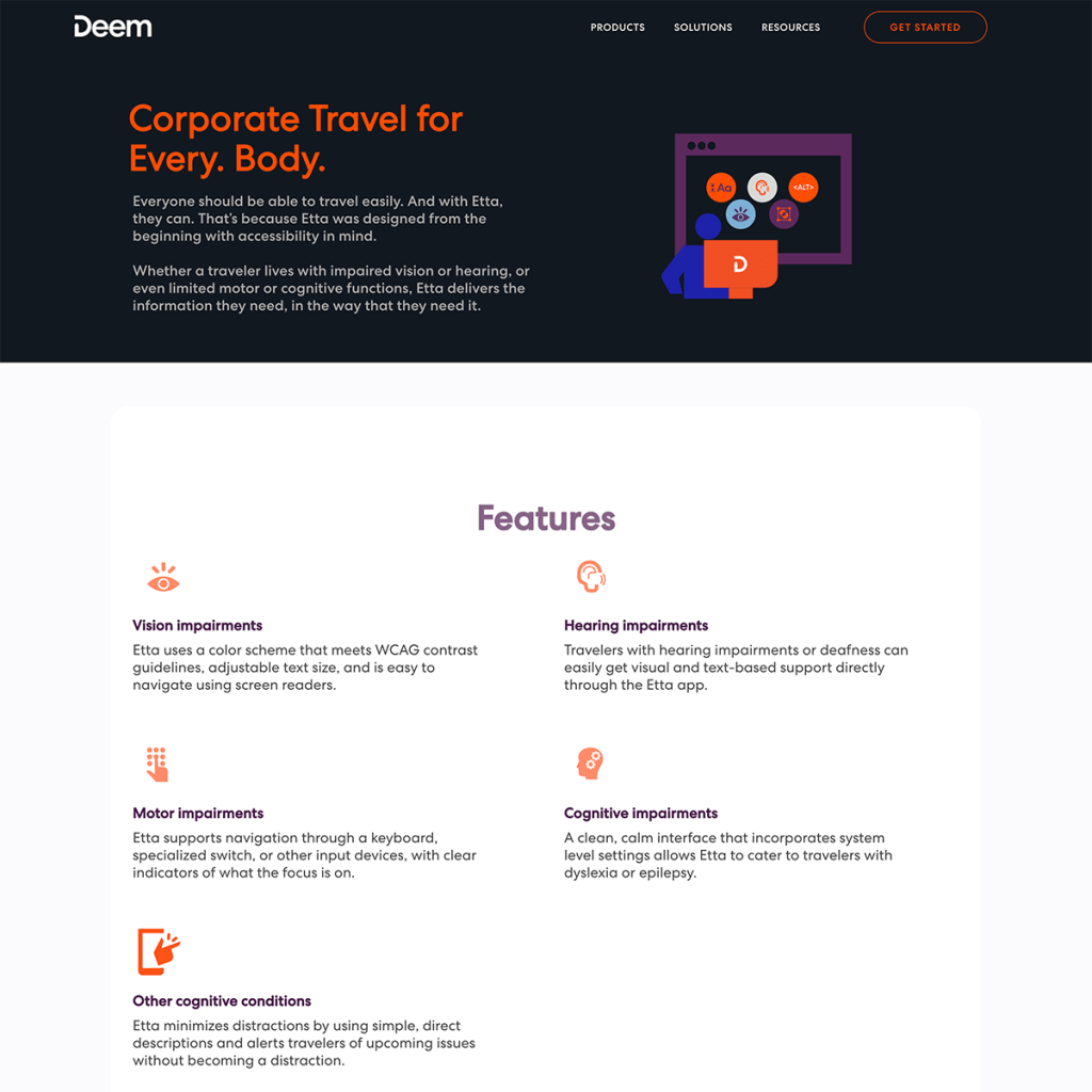 Deem is the only business travel booking platform built with accessibility features. I created a web page and won a few awards for Deem’s DE&I work.